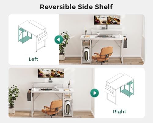 【Reversible Shelf Design】The shelf of our computer desk can be fixed on the left or right side of the desk according to your preference, allowing flexibility in positioning the computer tower. Please note that when it is placed on the left, the desktop side’s 5 holes will be on the outside.