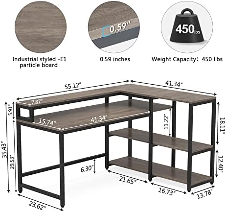 【Humanization Design】: Reversible L-Shaped, You can choose to install the storage shelf on the left or right side as per your needs. The monitor stand allows you to raise your screen to eye level, promoting a good posture, helps to reduce back & neck pain. A 29.53-inch high computer desk provides a very comfortable seating space.This desk can max your working, writing, study, gaming and reading enjoyment.