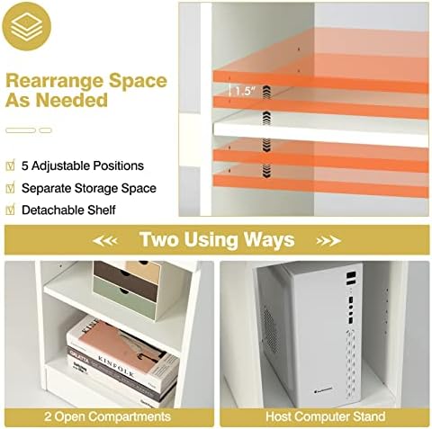 【Adjustable & Removable Shelves】The right side of the desk is equipped with a 2-tier open shelf, which can be adjusted up or down according to your needs. Each layer has a weight capacity of 66 lbs. There is also a divider at the bottom.
