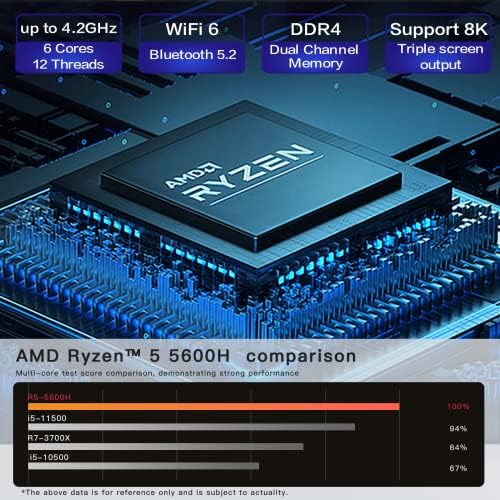 ★★★★★ Tiny Size, Powerful Body with Broad & Strong Heart ( CPU Ryzen 5 5600H ) — The size of this mini pc is 4.4 inches * 4.1 inches * 1.4 inches, very tiny computer, and it only weigh 0.8 lb, really lightweight mini desktop computers with windows 11 operating system.
