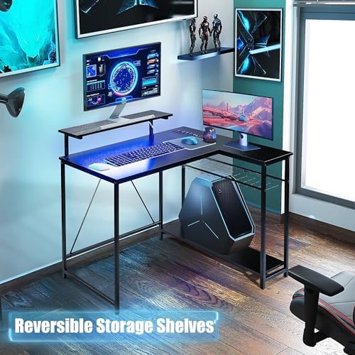 【Convenient Reversible Design】This Lshaped desk with storage shelves features a reversible design. The side storage rack could be built on the left or right to suit your specific needs, you can also combine two gaming desks into a large desk if need lager office area.An adjustable non-slip table mat that can protect the floor from scratches and prolong the use time.