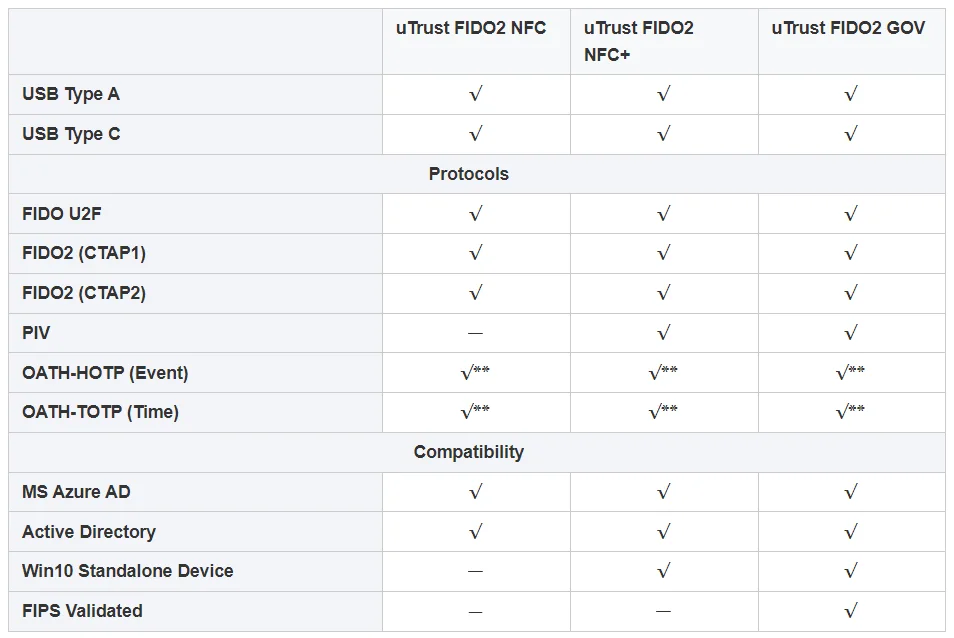 uTrust FIDO2 NFC Security Keys are available in two form factors: USB-A and USB-C. Both models feature near field communication (NFC) functionality for contactless sign-on to applications. Multi-protocol support for FIDO2, FIDO U2F, TOTP, HOTP, and WebAuth enables strong multi-factor authentication and removes the necessity for passwords.